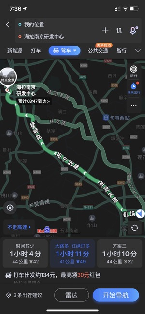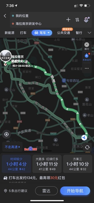 周一到周五從南京溧水機(jī)場路到江寧吉印大道地鐵站附近上下班往返,通常走兩條線路,一條從快速路246轉(zhuǎn)吉印大道。另一條從淮源大道>天祿大道>信誠大道(正方中路)>將軍大道,取決于拼車朋友進(jìn)行道路切換