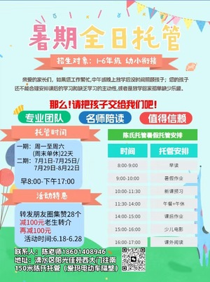 【全區(qū)最低價(jià),小班培訓(xùn),有資質(zhì),有5年以上教育經(jīng)驗(yàn),名額有限,一期還差3個(gè)名額封班,二期火爆招生中】時(shí)間:7月1日-25日/7月29日-8月22日 共二期 (周一至周六,早8:00-晚5:00)需要報(bào)名的抓緊時(shí)間參加活動(dòng):轉(zhuǎn)發(fā)朋友圈集贊28個(gè)立減100元老生轉(zhuǎn)介再減100元。地址